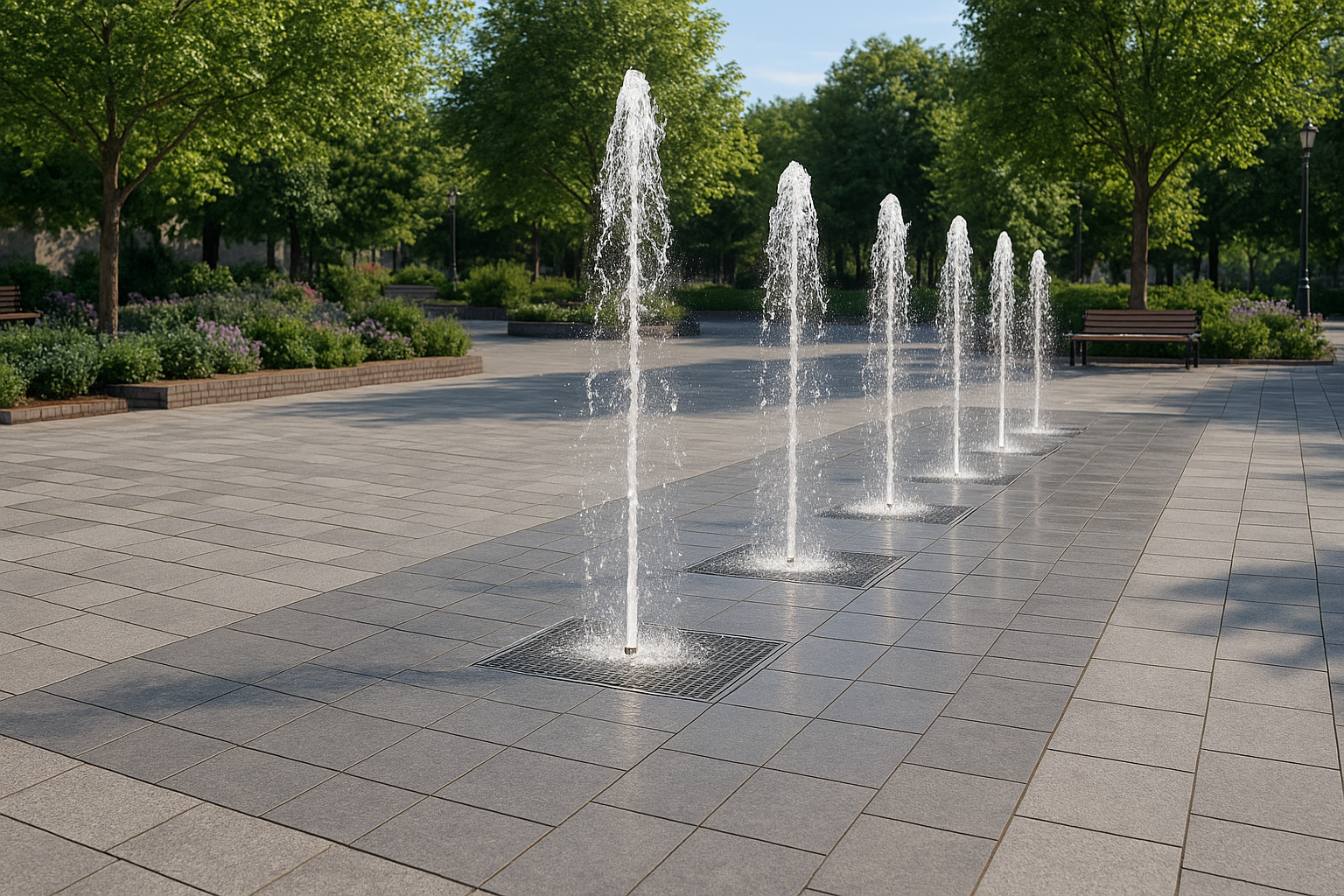 Υψηλή αισθητική: το συντριβάνι είναι “αόρατο” όταν δεν λειτουργεί, καθώς οι πλάκες παραμένουν στο ίδιο επίπεδο με το δάπεδο.