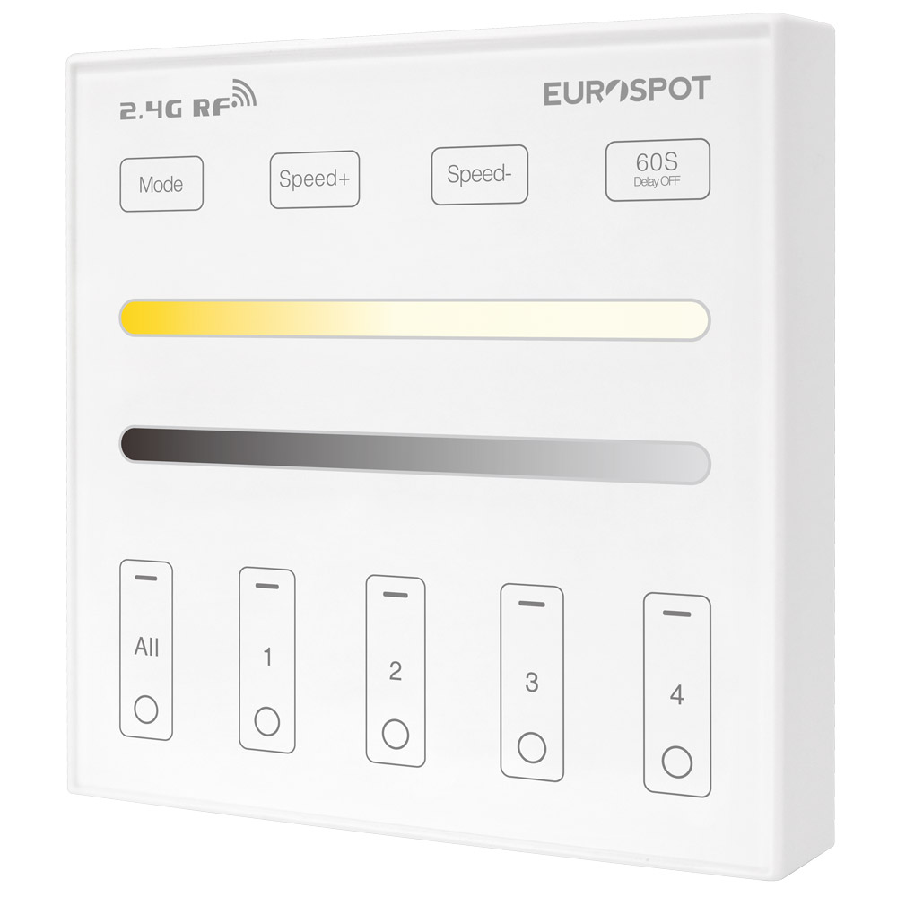 Το EuroSpot RF 2.4GHz επίτοιχο τηλεχειριστήριο είναι ένα τηλεκοντρόλ αφής για άμεσο και κομψό τρόπο διαχείρισης του Led φωτισμού σας. Κάνει χρήση ενός υψηλής ποιότητας πάνελ αφής προσφέροντας άμεσο έλεγχο των ζωνών καθώς και της θερμοκρασίας και φωτεινότητας χρώματος.