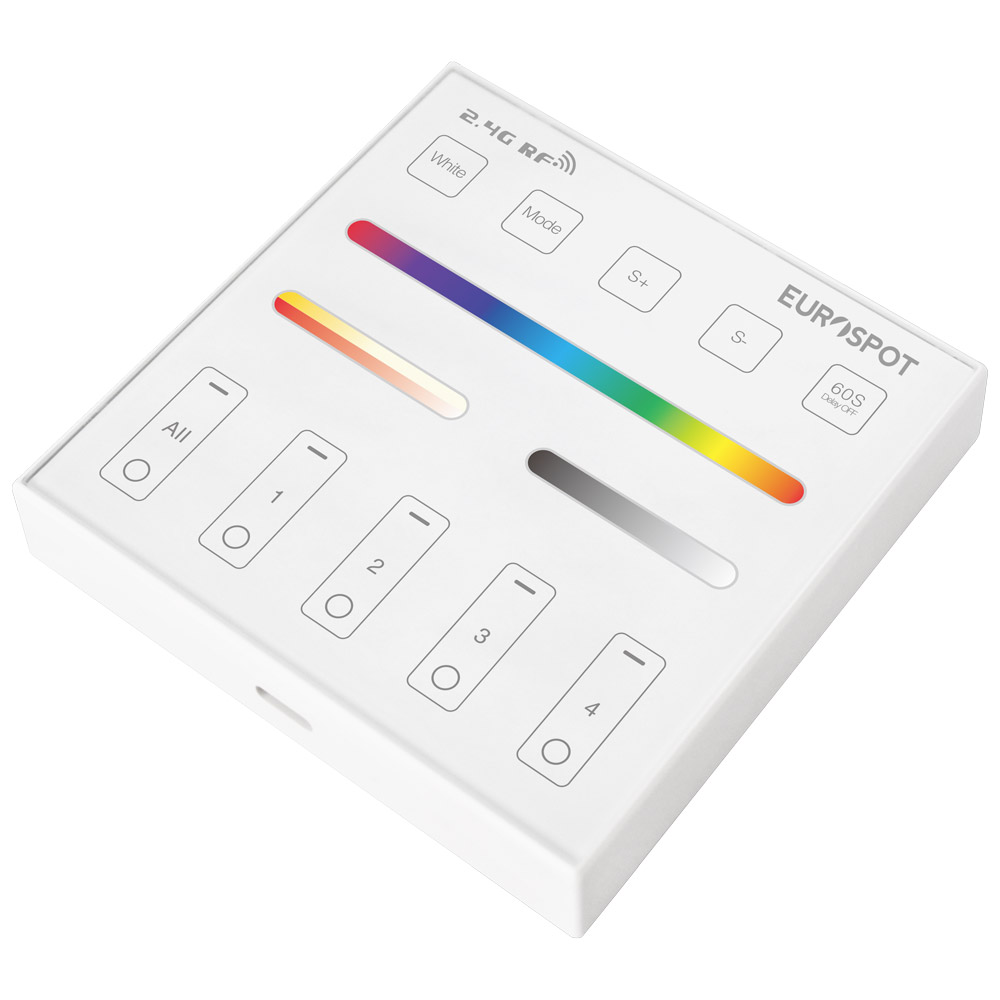 Το EuroSpot RF 2.4GHz επίτοιχο τηλεχειριστήριο είναι ένα τηλεκοντρόλ αφής για άμεσο και κομψό τρόπο διαχείρισης του Led φωτισμού σας. Κάνει χρήση ενός υψηλής ποιότητας πάνελ αφής, προσφέροντας άμεσο έλεγχο των ζωνών καθώς και των χρωματικών τόνων για RGB/ RGBW/ RGBCCT led-ταινίες αλλά και της θερμοκρασίας και φωτεινότητας χρώματος.