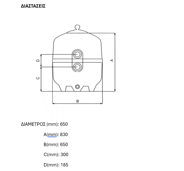 Τάπα 1¼” για εκκένωση του μέσου φίλτρανσης. Τάπα 1″ για εκκένωση του νερού.